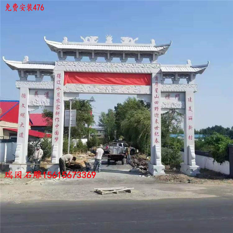 村庄入口牌坊的石材在新农村大门建设中一般选择花岗岩,花岗岩石质坚硬,抗腐蚀,这样的农村村门牌楼有着很高的艺术观赏价值和文化内涵,而且农村牌楼、村门牌坊也有很好的风水作用。