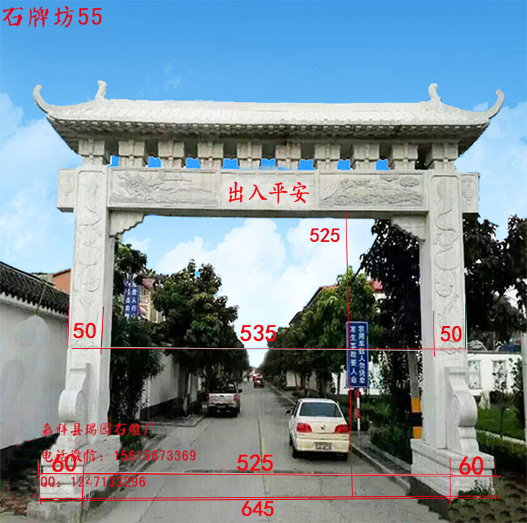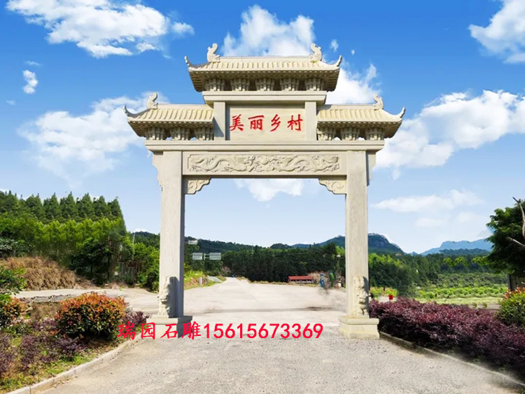 农村路口石牌坊三门样式,四柱三间结构庄重大气,雕刻精美,寓意丰富,是展现村庄气象的经典之选;单门小巧低调适合次要路口,石头门楼牌坊则彰显雄厚实力,工艺登峰造极。