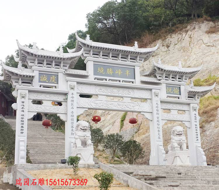 乡村三门石牌楼是兼具实用与文化韵味的标志性建筑,常见于村口或景区入口,采用花岗岩或青石建造,融合仿古或简约风格,尺寸需兼顾通行与美观,雕刻装饰体现地方特色,夜间灯光设计增强氛围,是展现乡村风貌和文化传承的重要载体。