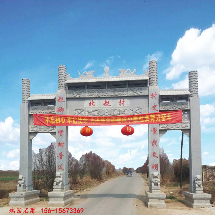 在中国广袤的农村地区,村口门楼牌坊作为村庄的标志性建筑,承载着深厚的文化内涵和独特的艺术价值。其中,三门三楼石牌坊以其经典大气的造型,成为农村地区常见的门楼样式之一。这种牌坊不仅具有实用功能,更是一种文化符号,展现了乡村的历史底蕴和审美追求。