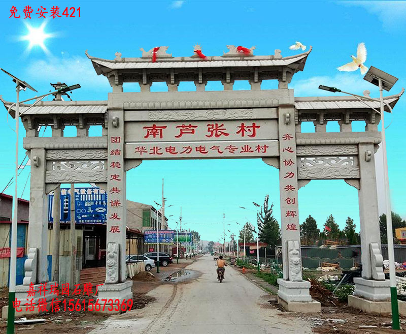 在石牌坊厂家提供的美丽乡村入口牌坊样式造型中,庄重大气、的石牌坊深受人们的喜爱。常见的乡村入口牌坊造型有一门三楼村口石牌坊、三门三楼村庄牌坊、三门五楼村门牌坊等等,无论什么样式的乡村石牌坊,都有着精美的雕刻纹饰及文采飞扬的对联,在新农村建设中起到了十分重要的作用。美丽乡村入口牌坊一般建造在村庄路口、农村村口等等空间序列轴线上,它对于空间的界定、文化氛围的引导具有相当的作用,不仅可以起到点缀风景、引人入胜的作用,还是村庄的门面标志。