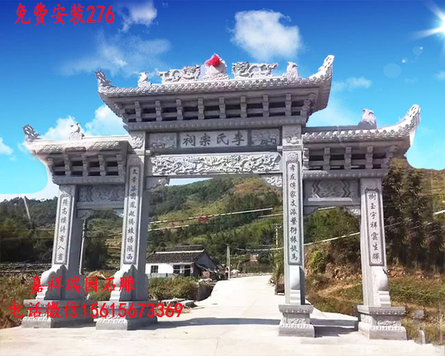祠堂大门牌坊作为宗祠建筑群中的点睛之笔,以其独特的造型和丰富的文化内涵吸引着无数人的目光。祠堂门口的牌坊牌楼,多采用石质或木质结构,顶部覆盖着青瓦或琉璃瓦,飞檐翘角,气势恢宏。牌楼上雕刻着各种吉祥图案和历史典故,如“鲤鱼跃龙门”、“松鹤延年”等,每一幅都栩栩如生,仿佛在诉说着一个个动人的故事。牌坊大门不仅是祠堂的标志,更是传统建筑艺术的璀璨明珠,展现了古代工匠的高超技艺和无穷智慧。