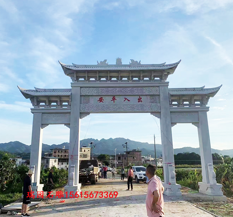 巍峨耸立农村村口的三门三楼石牌坊,宛如一位历经沧桑的老者,他用天然花岗岩修建的脊梁撑起岁月的重量。其三重檐楼式结构犹如展翅欲飞的鸿鹄,每道门洞都似时光隧道,串联起古今的对话。精雕细琢的牌匾如同凝固的史诗,在阳光下流转着青灰色的金属光泽,那些盘龙纹与云雷纹的浮雕,恰似蛟龙在石浪间腾挪游走。整座牌坊以严谨的中轴对称布局,将中国传统建筑"天人合一"的哲思,通过每一块规整的方石娓娓道来。