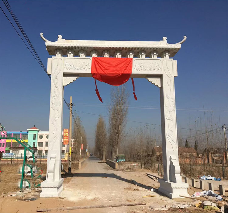 一门村庄石牌坊 新农村建设村口石牌楼的样式;随着城市化进程的加快,新农村建设也如火如荼地开展。在全国各地的农村,很多村庄的村口都矗立着一座庄严而美丽的石牌坊。这座石牌坊就是一门村庄的石牌坊,它承载着农村的希望和愿景,在新农村建设中有着重要的意义。