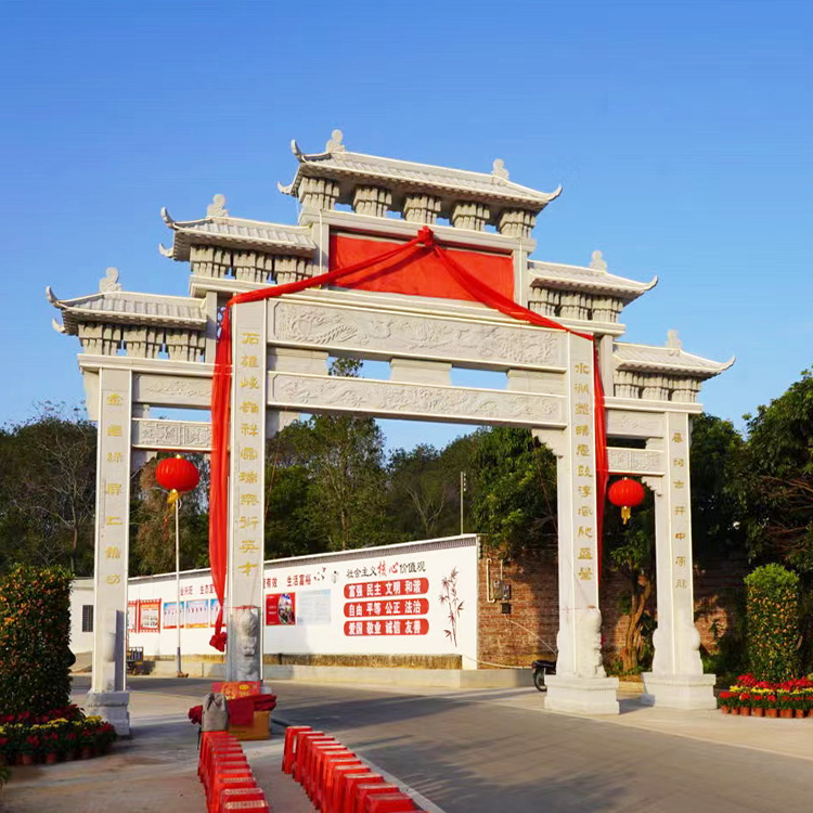 在美丽乡村建设中,定制农村石牌坊作为独特的乡土文化元素,展现出了乡村传统文化的魅力。这些石牌坊承载着丰富的历史信息,代表着人们对祖先的追思和纪念。石牌坊的建造一般依据当地的风土人情,采用地方特色的建筑风格,如北方常见的青砖石构式、南方常见的大型石坊、彩绘石牌坊等,在乡村中恰到好处的位置,给人以一种宁静、庄重、肃穆的印象。通过保护和修复现有石牌坊,乡村文化得以传承,历史底蕴得以彰显。