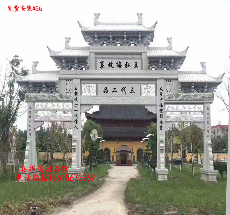 祠堂门头石牌坊的建筑特点主要体现在其材质、结构、雕刻工艺及整体风格上。首先,石材是其主要建筑材料,多选用花岗岩、大理石等质地坚硬、耐久性强的石材,这不仅保证了牌坊的稳固性,也赋予了其庄重而威严的气质。在结构上,石牌坊多采用梁柱式和拱券式两种形式,前者以横梁和立柱为主要支撑,造型庄重典雅;后者则以拱券和立柱相结合,展现出更为豪华的气势。雕刻工艺是石牌坊的一大亮点,浮雕、透雕、圆雕等多种技法并用,图案内容丰富多样,既有龙、凤、狮子、麒麟等传统吉祥图案,也有历史人物、神话传说等题材,无不精雕细琢,栩栩如生。