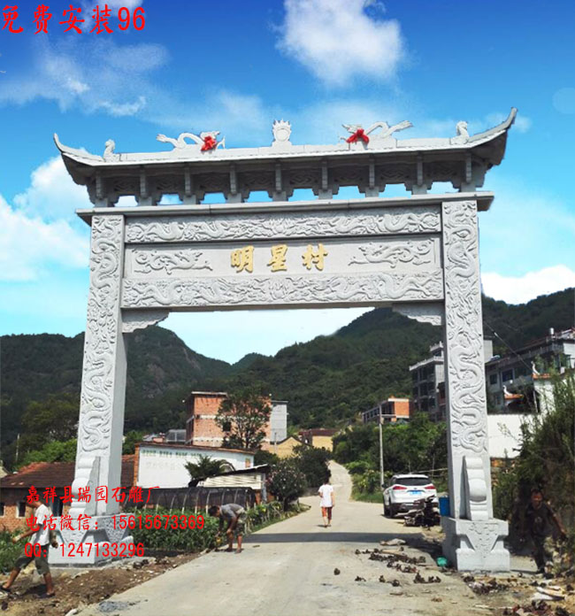 现代新农村牌坊图片大全-现代风格新农村牌坊图片效果图;在广东许多村子都建了村口石牌坊,从石牌坊照片看来,这种现代风格新农村牌坊制作精致,雕工细致,关键以单门石牌坊和三门石牌坊手工雕刻造型设计主导。将石牌坊做为乡村村口大门口,村口室内空间的关键组一部分,这由于村口牌坊,是一座独特的装饰艺术、***性建筑。