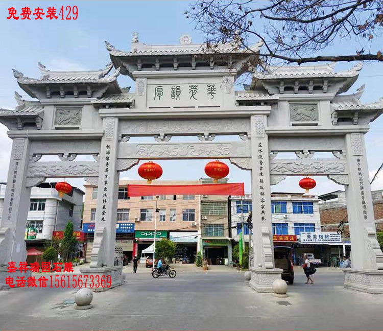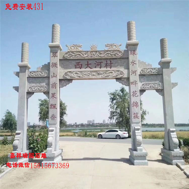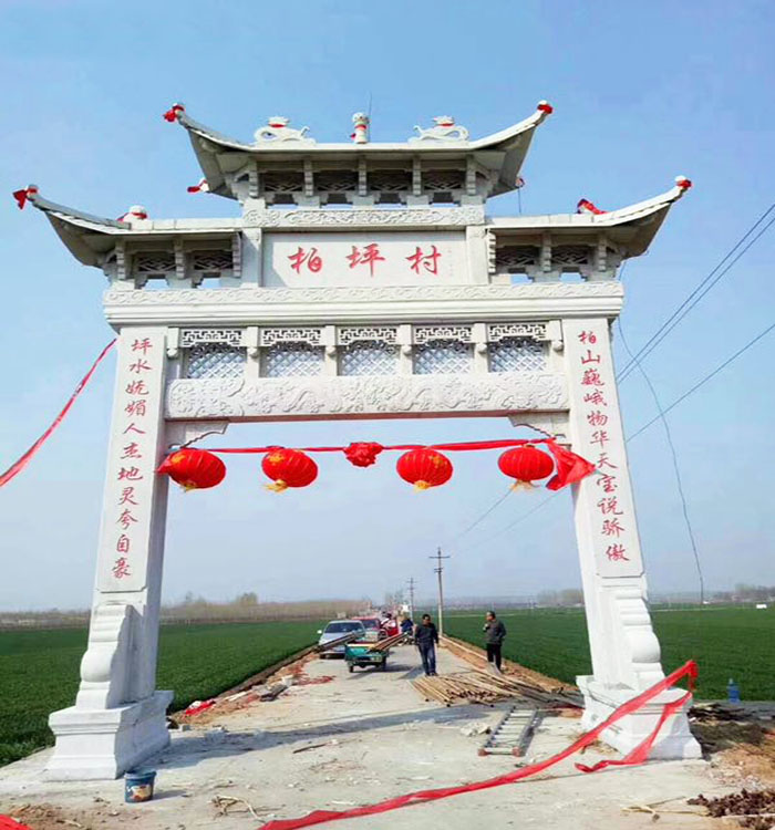 农村路口石牌坊修建是能承载人们情感;能聚集我们人缘、地气、福源、财气、官运于一体的农村村口石牌坊,村庄路口牌坊建成,村道畅通,门风集福,从而彰显人们的善良、淳朴、勤劳、团结的精神风貌;必将会全村兴旺发达,人才辈出,富贵双全,丁财两旺,事业有成,全村个个沾光。随着人们生活水平的提高,相信会有越来越多的新农村,建造农村路口石牌坊作为本村的形象代表。农村修建门楼牌坊基本上都是在村头进行的,也有一些农村会在进村口和出村口各修建一座石牌坊,来彰显本村的精神面貌和经济实力,乡村修建村庄路口牌坊全部采用石头雕刻的,修建这样农村路口牌坊还是非常不错的。