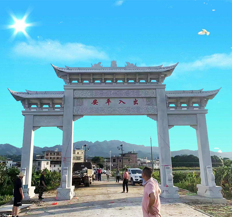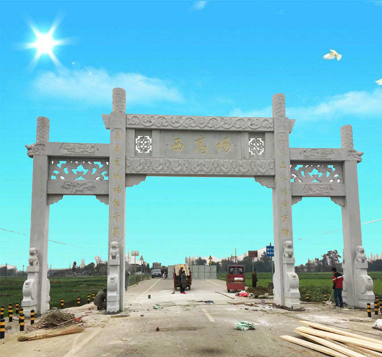 建造村庄入口大门牌坊牌楼,主要以单门石牌坊和三门石牌坊为主,如一门三楼石牌坊、三门三楼石牌坊、三门五楼石牌坊等等。无论什么样式的村庄入口大门图片,其中门开间要宽敞气派,方便人们出现,而且每个人踏入村庄大门,就能让人认识到,它显要而突出的地位。