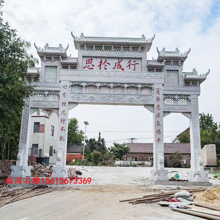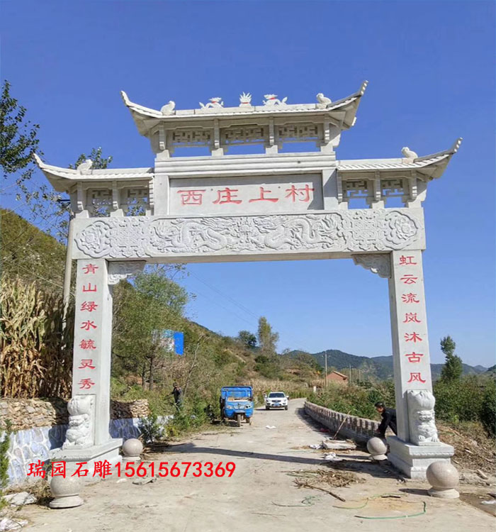 首先,我们来看一种常见的样式——拱形门牌坊。这种样式的门牌坊以拱形设计为主,采用传统的琉璃瓦作为顶部覆盖,给人一种古朴典雅的感觉。门牌坊两侧常常雕刻着浮雕图案,如水墨山水、花鸟、龙凤等,图案精美细致,传递了吉祥、丰收和幸福的寓意。同时,门牌坊上还经常刻写着乡村名字、村庄口号或者村规民约,彰显了地方文化和村庄的宗旨。