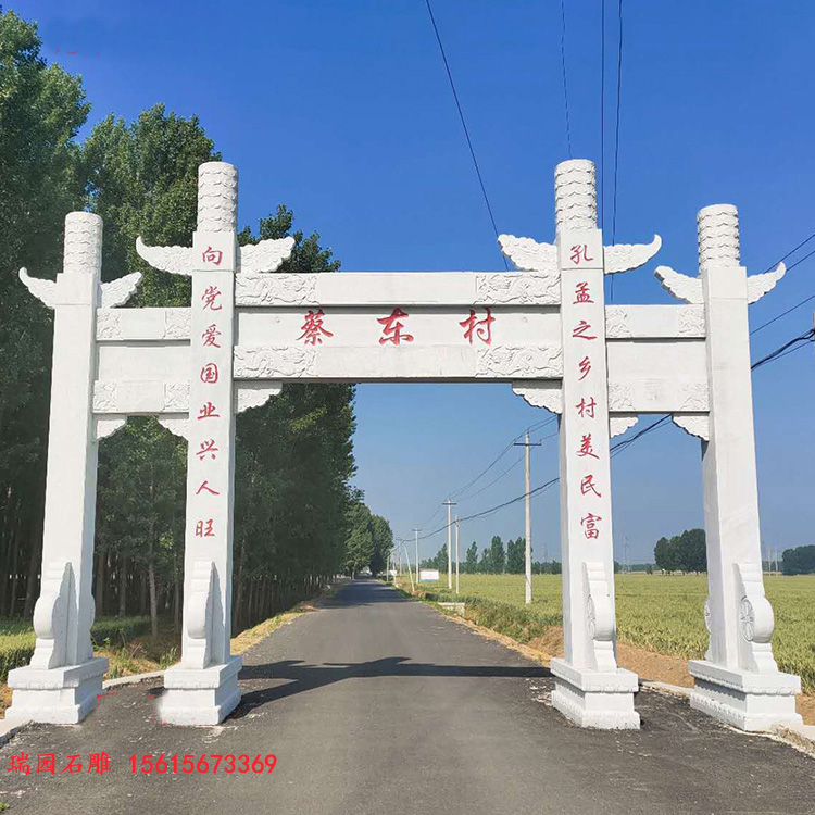 新农村村口牌坊,往往是村庄精心打造的“门面”。从图片上看,其规模宏大,气势不凡。有的牌坊高达数丈,以坚固耐用的石材构建,如花岗岩、青石等,这些石材质地坚硬,历经岁月洗礼也能保持稳固。牌坊的结构设计精巧,斗拱飞檐、横梁立柱,每一处都彰显着精湛的工艺。斗拱部分层层叠加,错落有致,不仅起到支撑作用,更增添了建筑的灵动与庄重;飞檐则宛如展翅欲飞的鸟儿,轻盈而富有动感,给人以向上的力量。