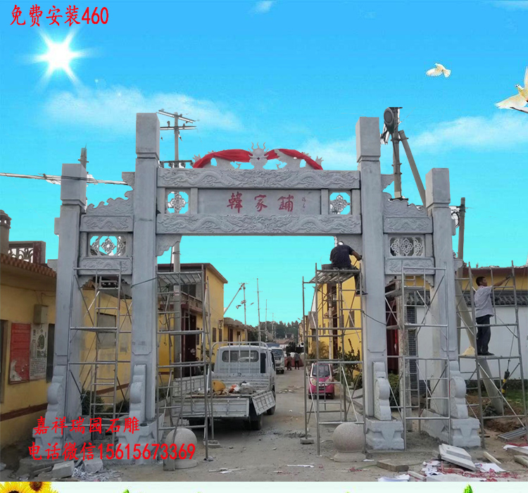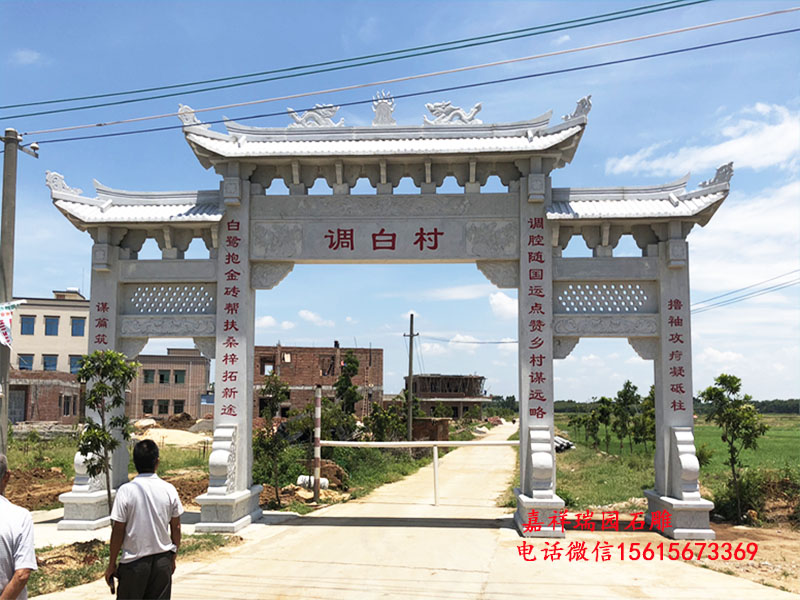 村庄口修建石牌坊的经典样式三门三楼式;村庄口石牌坊经常修建在村庄村口、入口、街道出入口、村庄路口等空间序列或轴线上,它对于装饰美化村庄环境、空间的界定、文化氛围的引导,具有相当的作用。村庄口石牌坊安装好可以历经百年风雨而屹立不倒,可以毫不夸张地说,精美的村口石牌坊,是农村传统文化的重要载体,每一座村庄石牌坊上面,都蕴含着丰富的文化内涵。