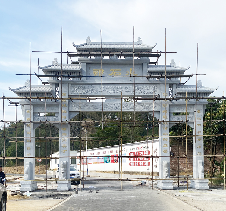 新农村门楼石牌坊设计造型多样,纹饰雕刻也更为细致精美,在图案元素选择上也比较多,主题图案也比较灵活,在实际雕刻建造的时候,可以根据当地农村的文化特色等来选择,增加整座石牌坊的灵韵。当然新农村进村石门楼牌坊雕刻的话,是讲究祥瑞美好,在雕刻主题上也都会各有不同,比如祥瑞灵兽图案、自然山水图案、神话故事图案、民间故事、花鸟虫鱼图案等等,增加了整座石牌坊的工艺之美。