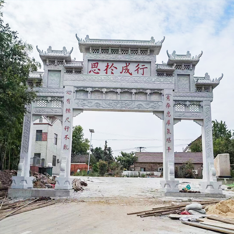 传统风格的石牌坊是乡村入口建设中最常见的一种样式。这类石牌坊通常采用了传统的中国风格元素,如红墙黛瓦、雕花窗棂、飞檐翘角等,展现出悠久的历史文化和浓厚的地方特色。这样的石牌坊让人回想起古代乡村的风貌,如同穿越时空的一扇窗口。图片一展示了一座传统风格的石牌坊,它巍峨的外观以及精美的雕刻给人留下深刻的印象。