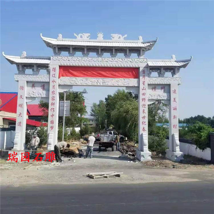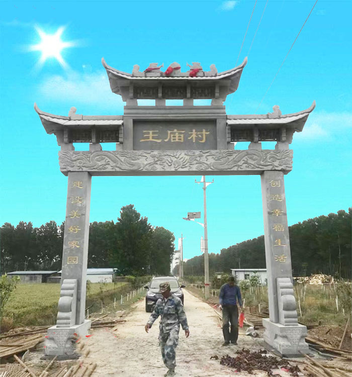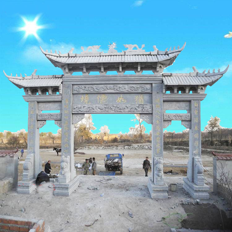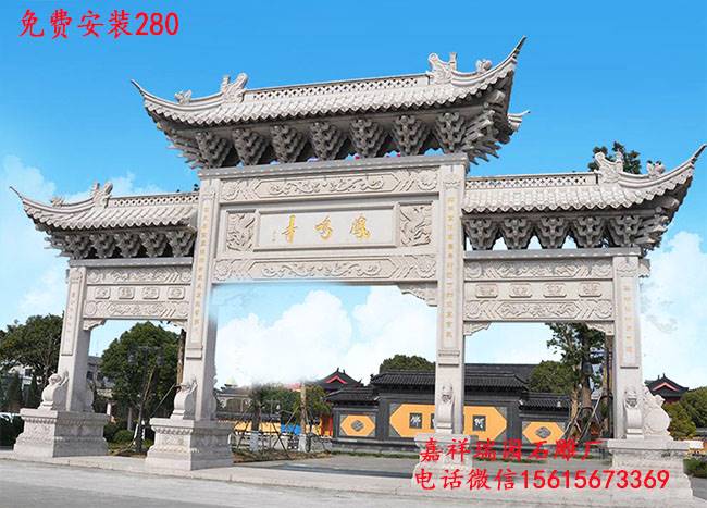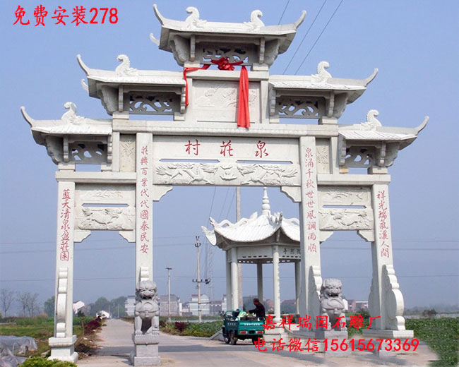 适合安装在旅游区、村庄、陵园的石雕牌坊雕刻图片,这座牌坊气势宏大,图案精美、在错落有致的村庄衬托下,加上后面群山环绕,风景如诗如画。在中国传统建筑中,石雕牌匾是不可缺少的素材,古代十分重视书法艺术或题额者的地位.以提高悬挂匾额场所的声誉。古代的贵族、高官、功臣、名士,往往以得到当时皇帝题赐的匾额来炫耀权势。石雕匾额的悬挂不仅可以表现出书写者的才华与文采,并且透过视觉与意念的传达,塑造空间的风格。同时,精镂细琢的雕饰更是为其增添了不少风姿。牌匾文化请阅读;徽州石牌坊牌楼修建制作介绍