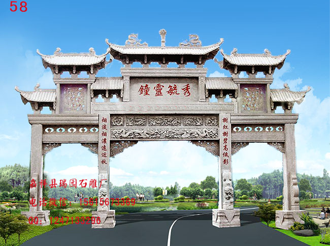 农村石门楼雕刻样式,农村石门楼是传统的汉族建筑物,这是用石材修建的。在古代这是为表彰功勋、科第以及忠孝节义所立的建筑物,古代人也非常重视,能够有当时皇帝赐予的一款石门楼,可以说这个家族是非常的荣耀,在当地也是很显赫的。石门楼的制作就是采用雕刻手法,在石牌上进行刻字或是刻画,现在也有专门做牌坊的手艺石门楼"厂家,石门楼雕刻艺术可分为两种,一种为"高浮雕",这种作品粗犷豪放,立体感到强烈,能够产生出逼真的艺术效果;另一种为"浅浮雕",它表示细腻,线条明快,忽隐忽现,犹如一首优美好看的"朦胧诗"。从构图上看艺人仍遵循着"画中要有戏,百看才不腻"中的国传统绘画的立意特点。