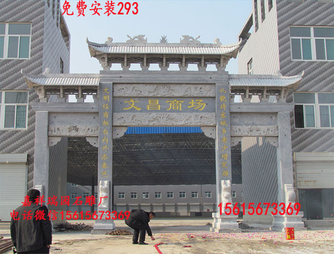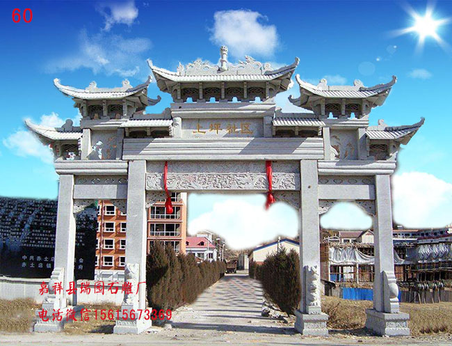 石门楼的样式设计;门楼在历***0早是单门形式,简单的两根柱子架着一根横梁,随着应用和历史发展,门楼也开始出现了多种设计形式,特别是三门牌楼、五门牌楼等,当然也有了现代化的设计理念。在村口石门楼雕刻的时候就要对风格样式有一定了解,看到底需要什么样的设计样式,风格方案等也都可以有所考虑,一般都是要结合自我农村区域文化特色以及建造应用要求等考虑,样式可以为出头式,也可以为不出头式,具体还是要结合当地的建造应用需要来搭配设计。