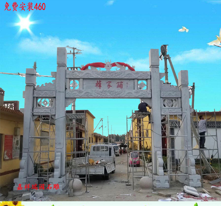 农村大门门楼牌坊及简易村口门楼图片样式;农村牌楼门头、现代村口大门门头石牌坊有很多种,有檐楼的叫做门楼或者牌楼,没有檐楼的很多农村叫做简易门头或者农村牌坊。这种农村门楼样式按照门的数量可以分为以下几类:一门门楼、三门门楼和五门门楼,一门门楼又分为有檐楼的牌楼和没有檐楼的牌坊大两种。按照雕刻图案区分有浅浮雕、深浮雕、透雕几种。我们瑞园石雕根据数十年制作农村牌坊门楼效果图和实际安装的样式总结出常用的图片样式,供需要农村门楼牌楼的乡村参考。
