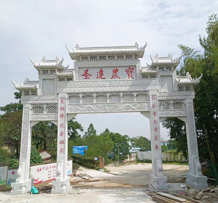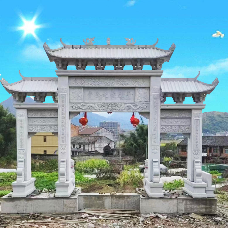 1. 独特的建筑风格:一门三门花岗岩牌楼是新农村石牌坊的一种形式,其设计独特而精美。一门指牌楼拥有一道门洞,体现出一种豪华与宽容;而三门指牌楼则有三个门洞,更显得宏伟与庄重。两者可以根据不同的地区和历史文化背景进行设计,凸显出地方特色。